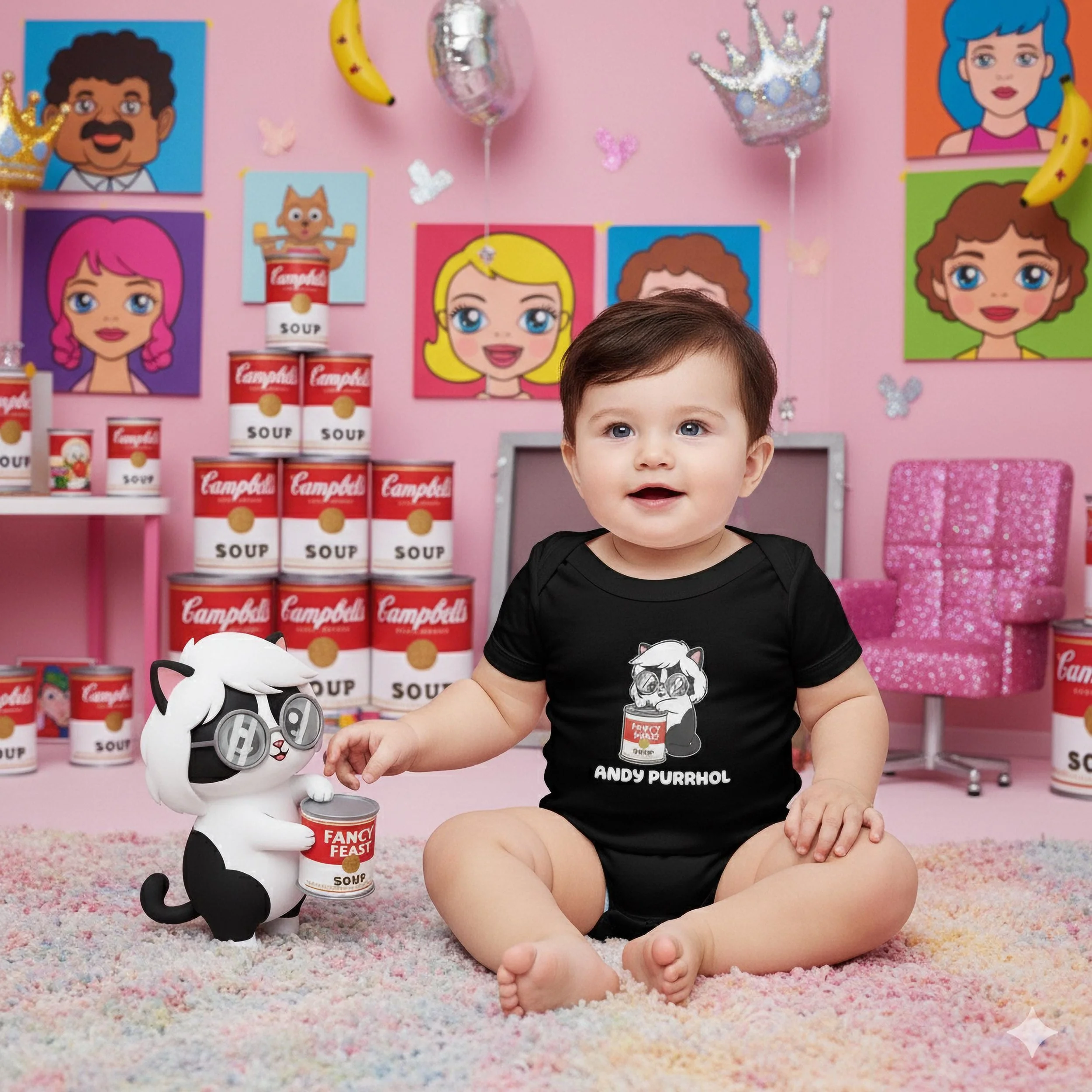 Your little artist is pictured posing like a true celebrity with a can of "Fancy Feast Soup," a clever nod to Warhol's famous Campbell's Soup Cans. It’s a hilarious, stylish, and unique design that's perfect for parents who appreciate the intersection of high art, pop culture, and cat antics.