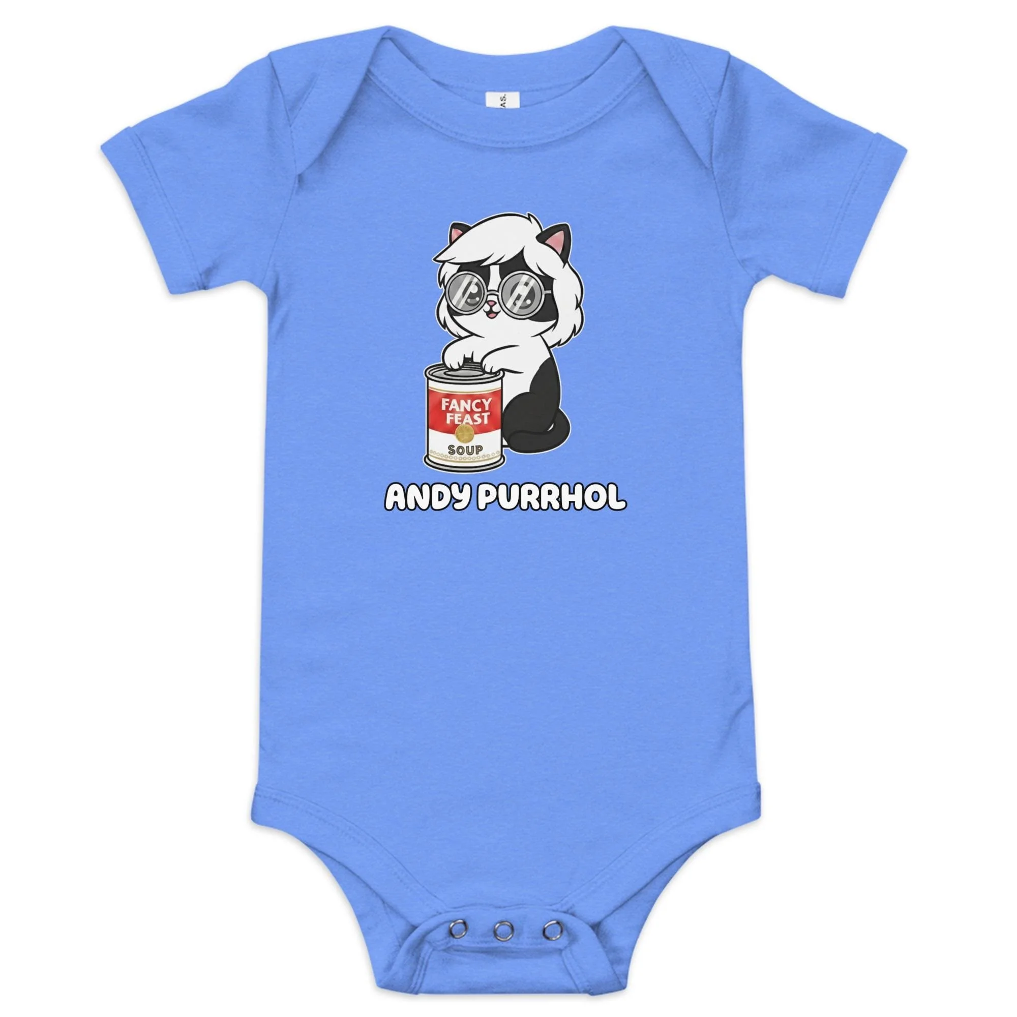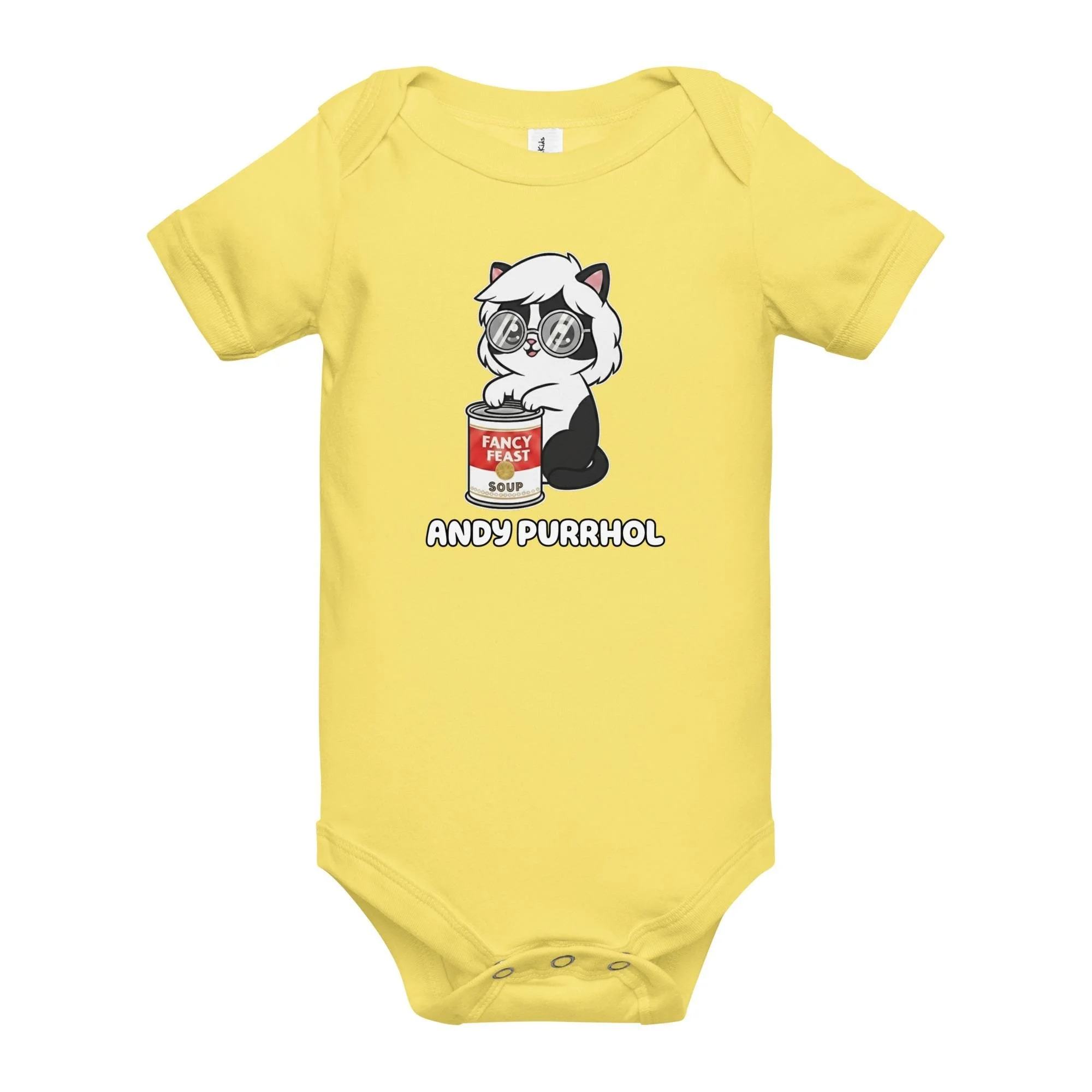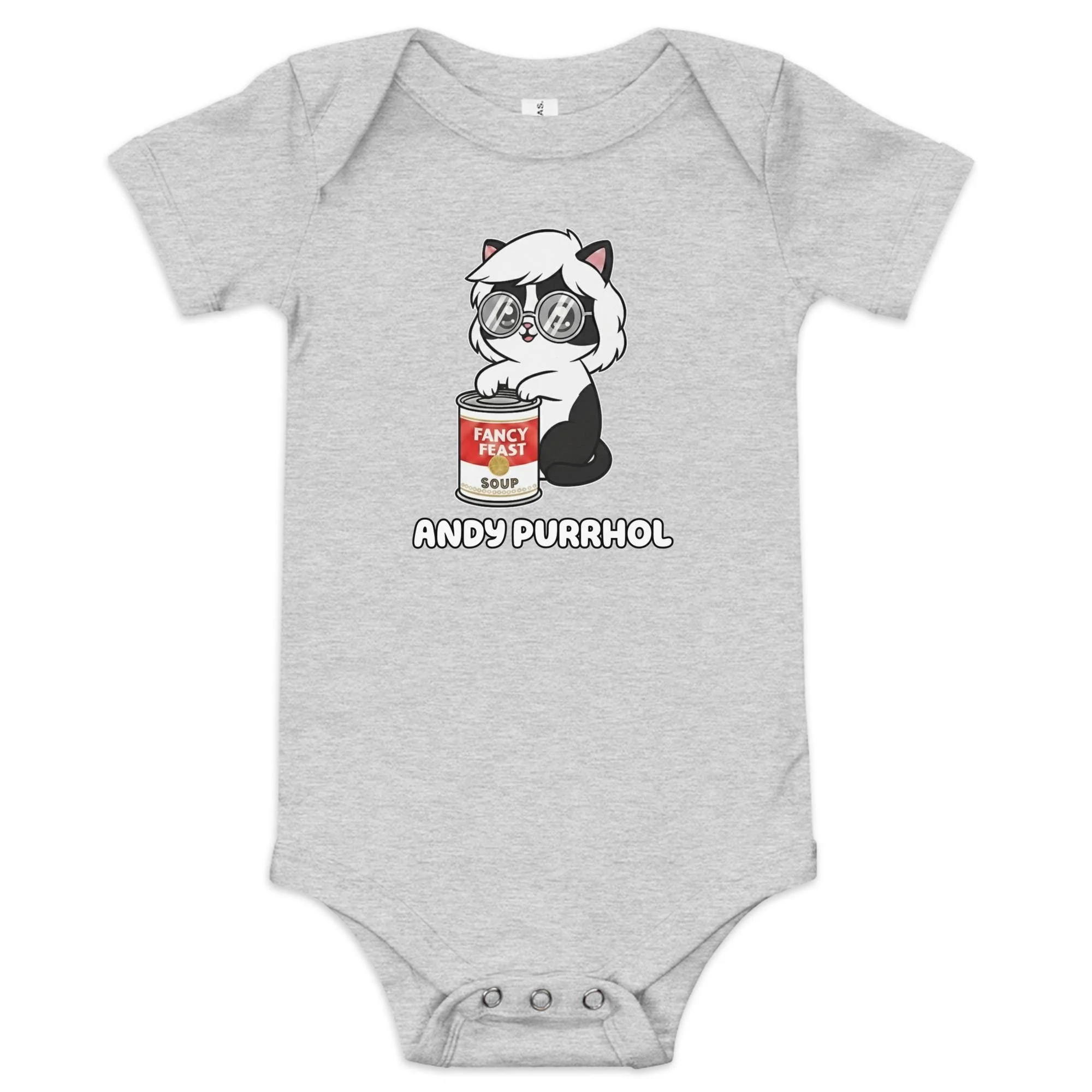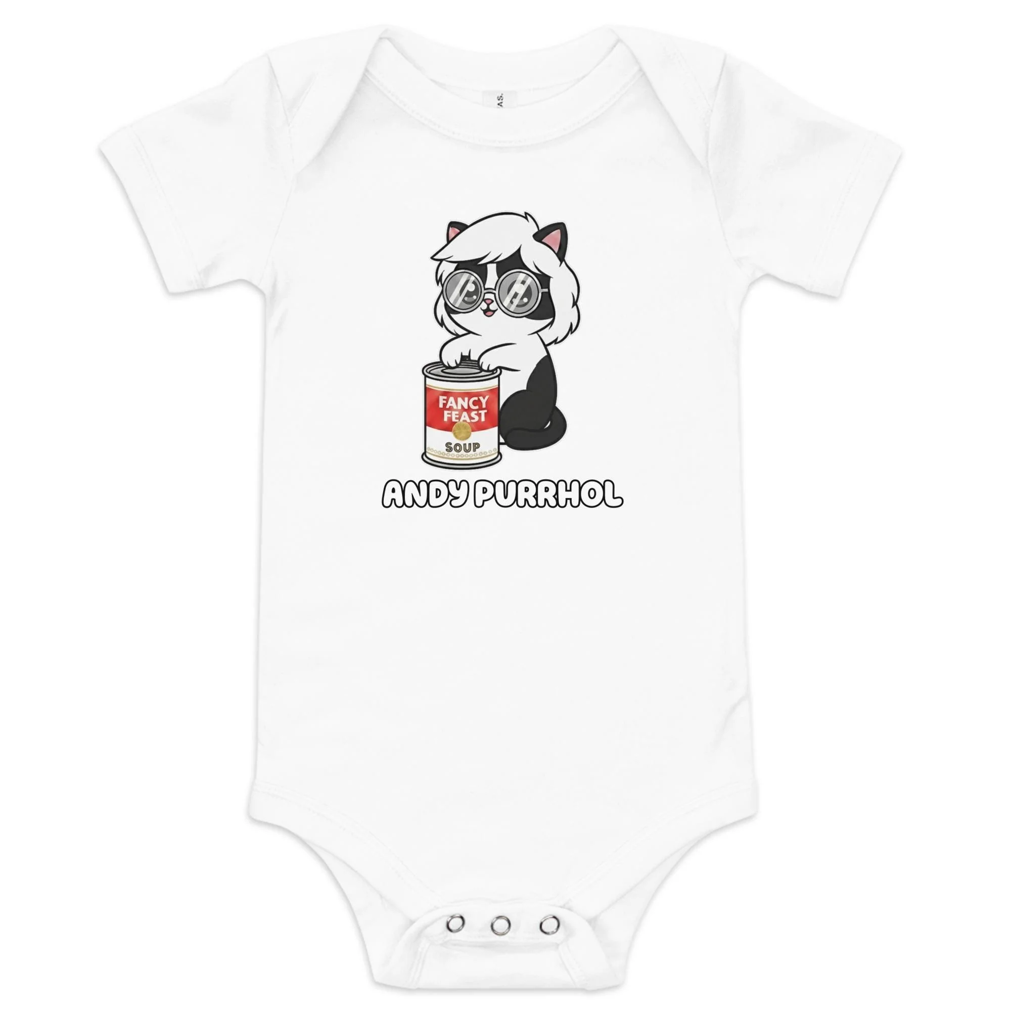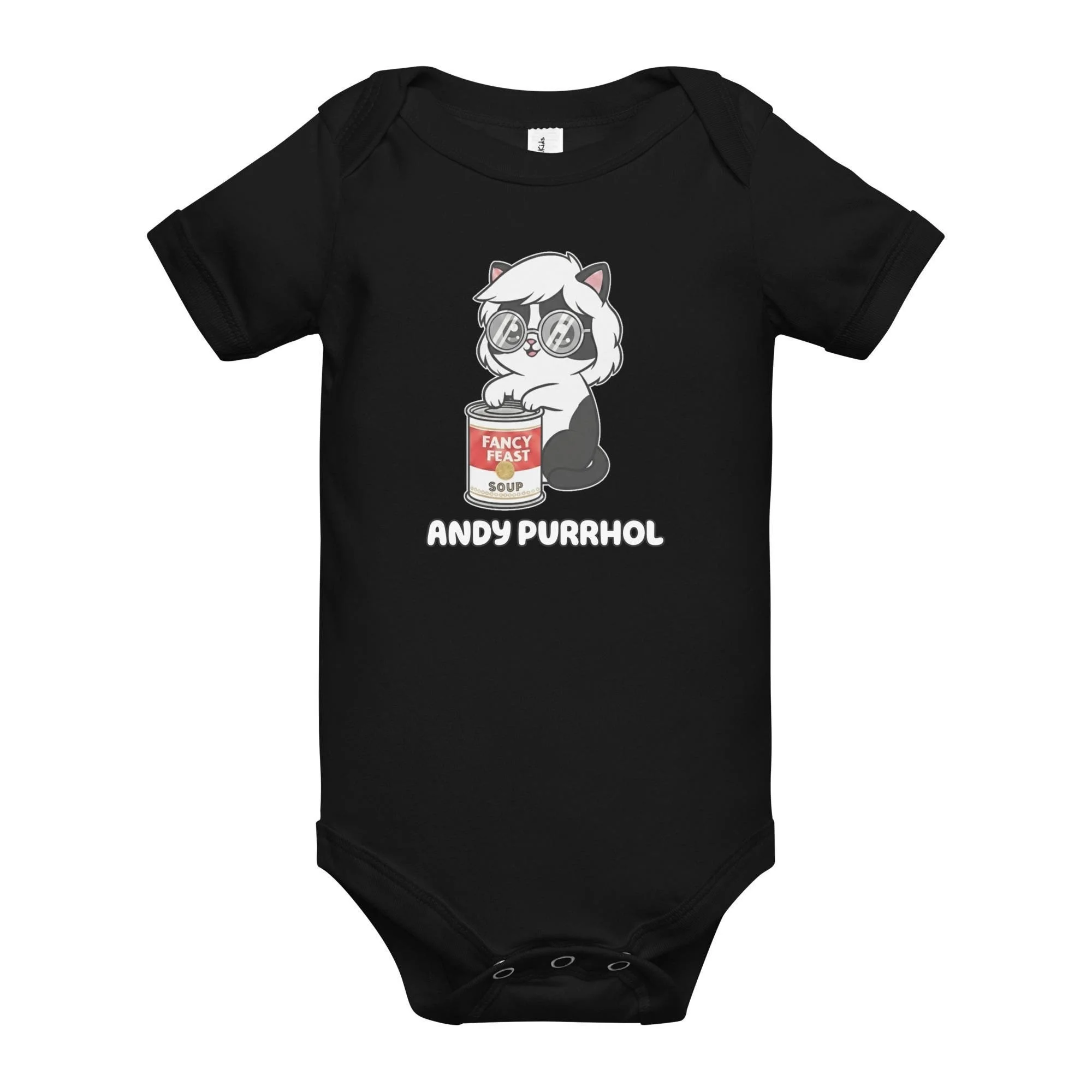 Give the smallest member of your family their very own Pop Art debut! This adorable Andy Purrhol Baby One-Piece features the unforgettable illustration of a black-and-white kitten wearing Andy Warhol's signature silver wig and round glasses.
