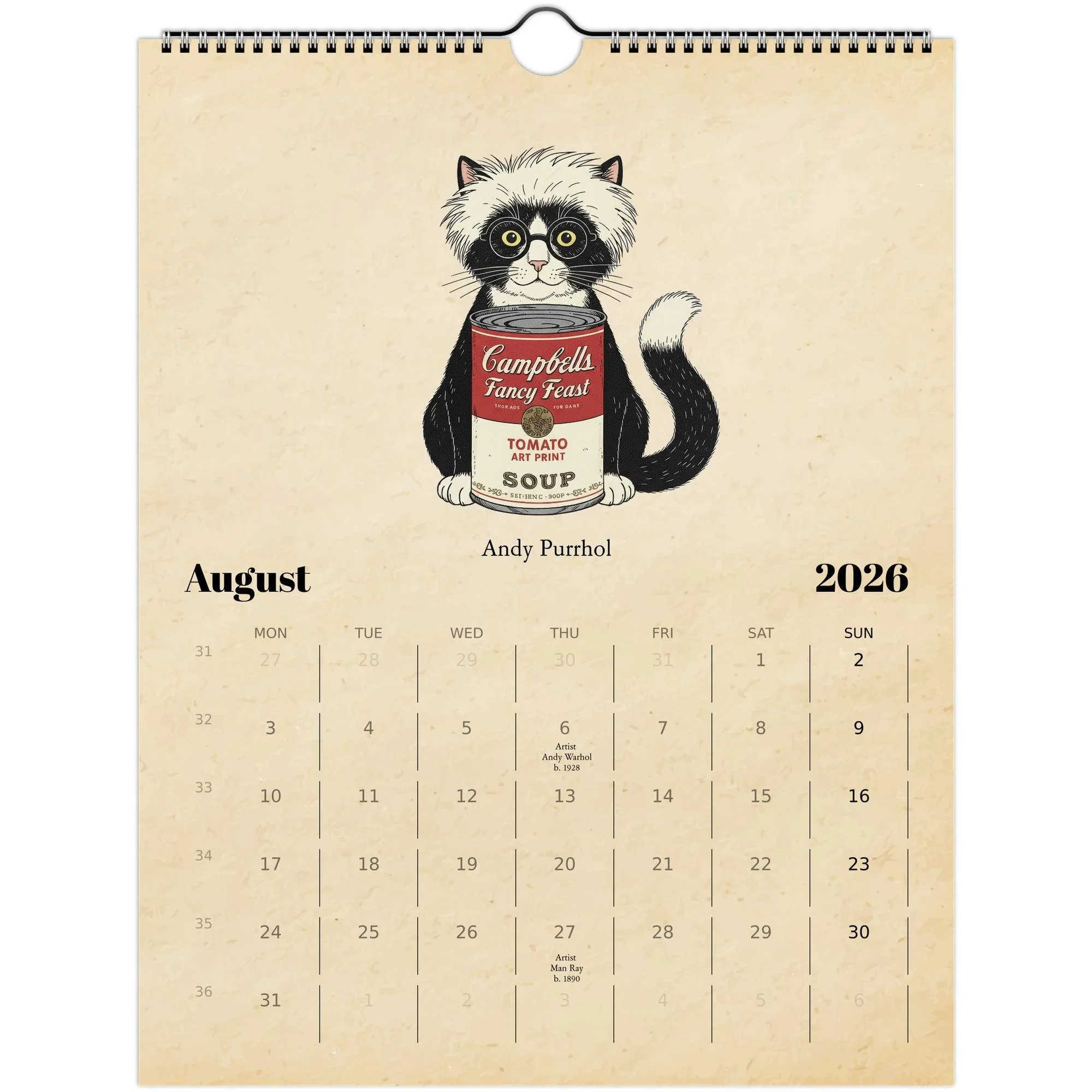 🖌️ January — Jack Rabbit Pollock 🐑 February — Sheepard Fairey 🎃 March — Yayoi Pawsama 🐈 April — Joan Meow 🐊 May — Salvador Daligator 🐧 June — Paul Penguin 🌺 July — Frida Catlo 🐾 August — Andy Purrhol (Soup Can Edition) 🐩 September — Helen Frankenhowler 💥 October — Roy Licktenstein 🦊 November — Georgia O’Keeffox 🐶 December — Ed Woofcha