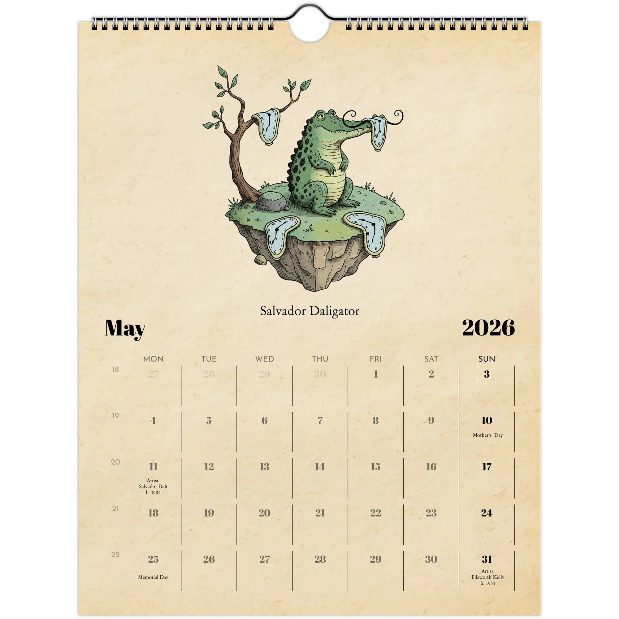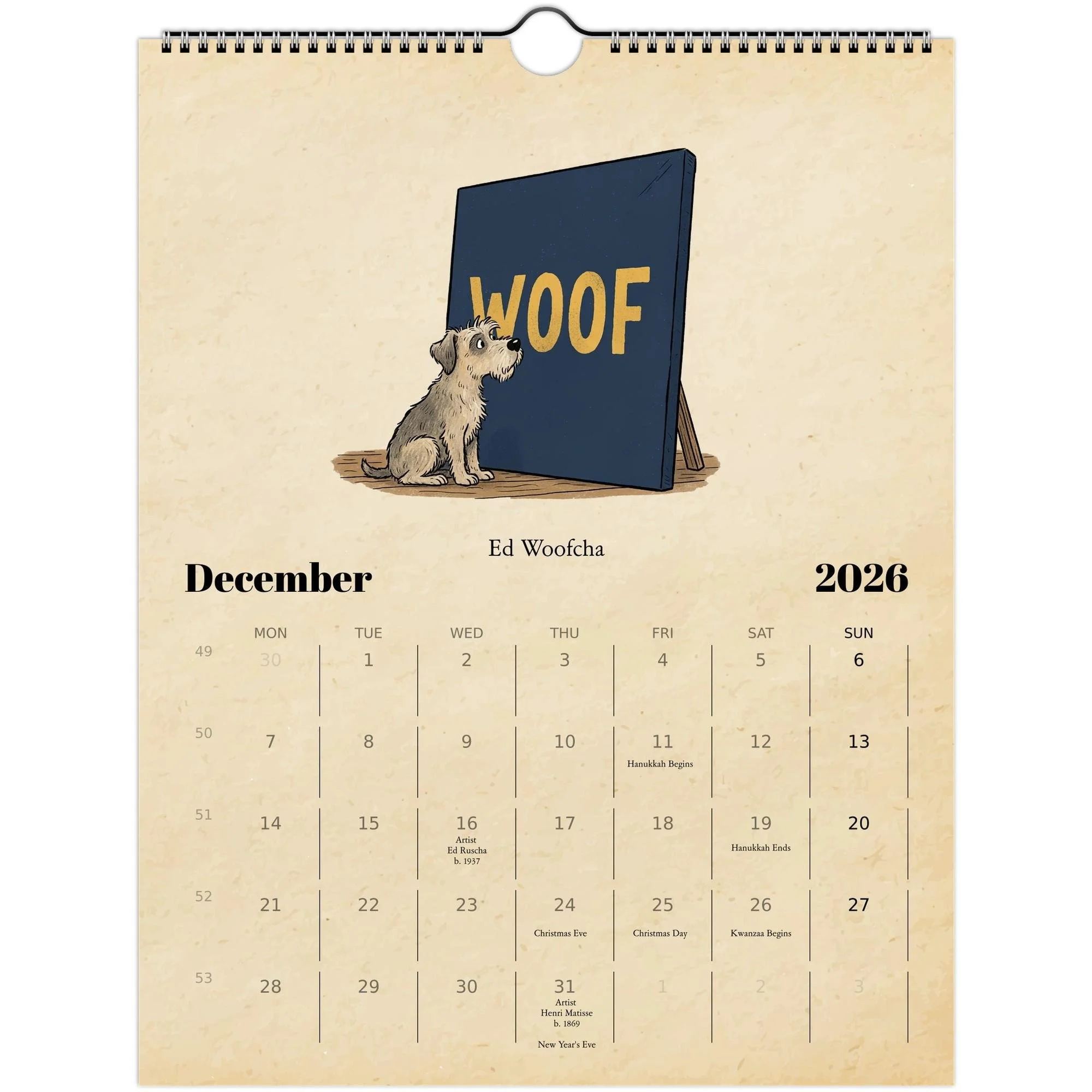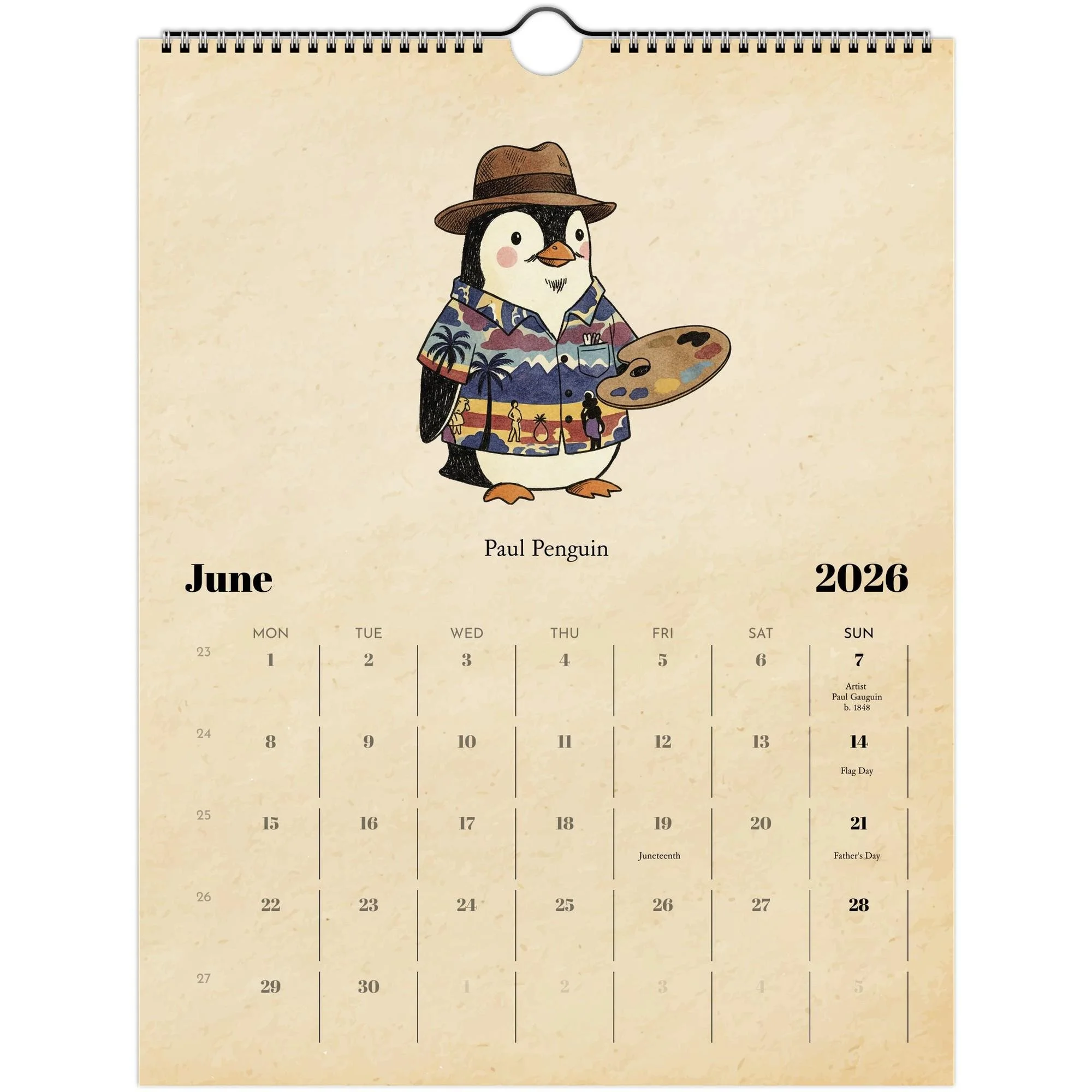 📘 Product Details • Size: 8.5×11" (closed) / 17×11" (open) • Paper: 250gsm coated silk (100 lb cover) • Finish: Full-color, high-resolution printing • Binding: Spiral-bound with centered hanging loop • Includes: Major U.S. holidays + birthdays of the featured artists • Design: Vintage parchment background + hand-drawn illustrations • Printed on demand locally in the U.S. through Gelato • Eco-friendly: FSC/PESC-certified papers and sustainable production