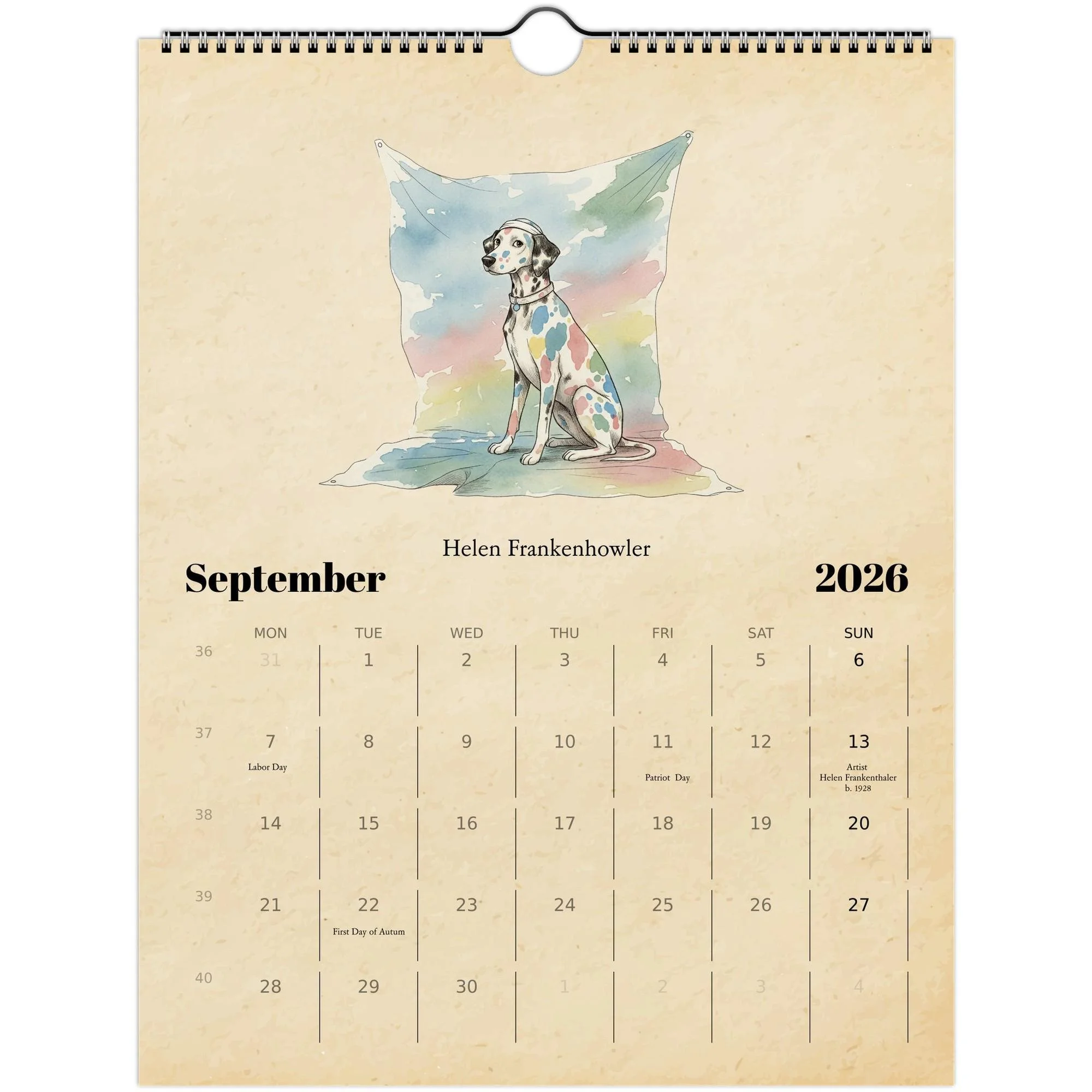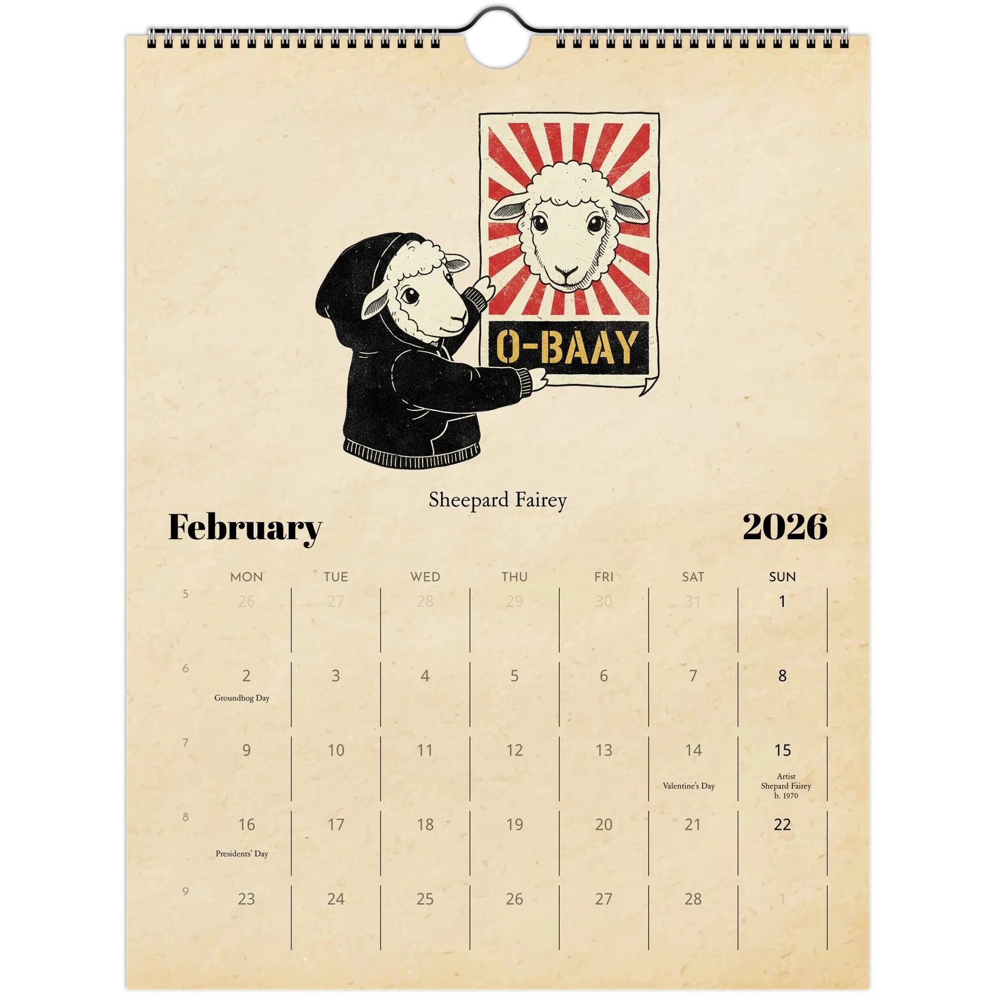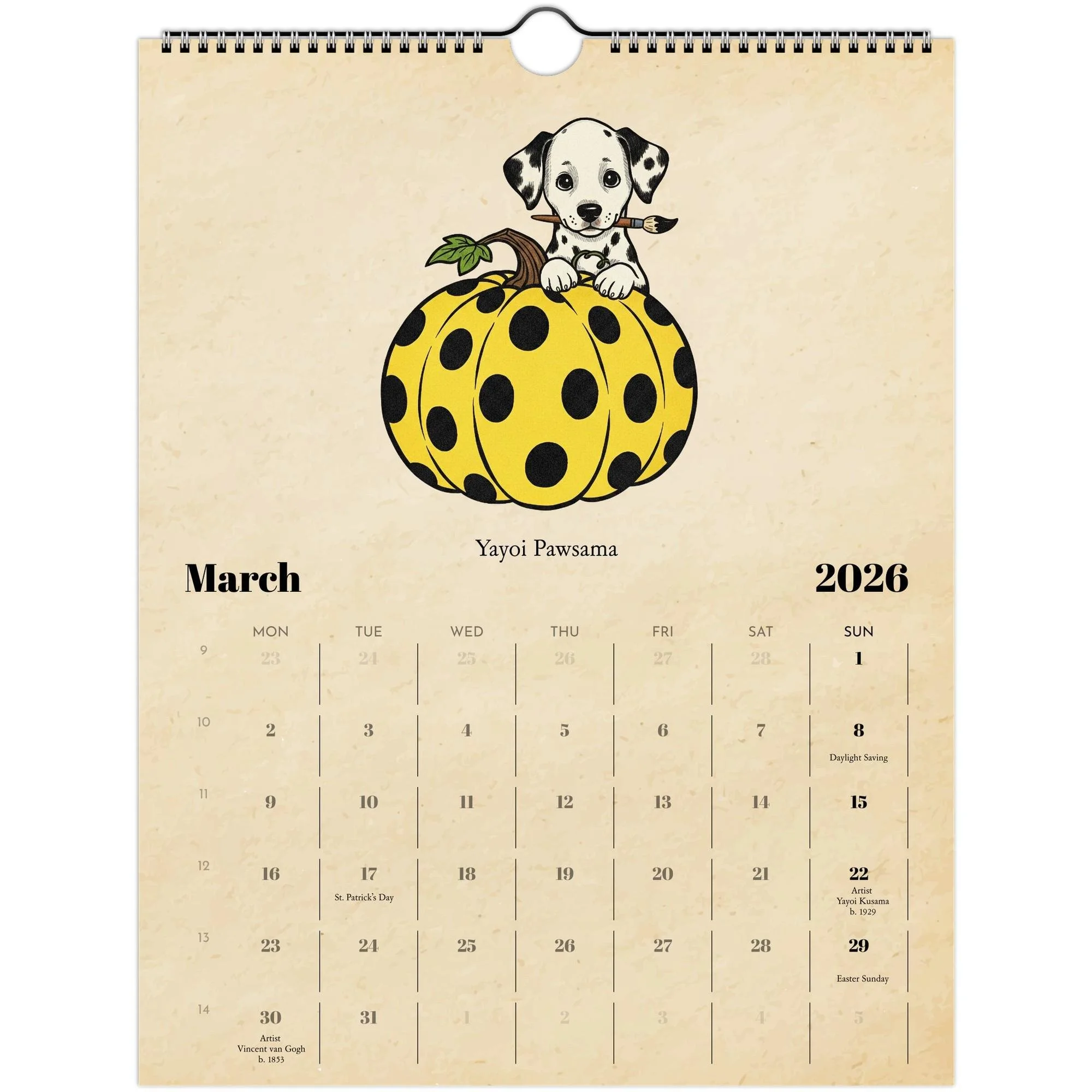 📘 Product Details • Size: 8.5×11" (closed) / 17×11" (open) • Paper: 250gsm coated silk (100 lb cover) • Finish: Full-color, high-resolution printing • Binding: Spiral-bound with centered hanging loop • Includes: Major U.S. holidays + birthdays of the featured artists • Design: Vintage parchment background + hand-drawn illustrations • Printed on demand locally in the U.S. through Gelato • Eco-friendly: FSC/PESC-certified papers and sustainable production