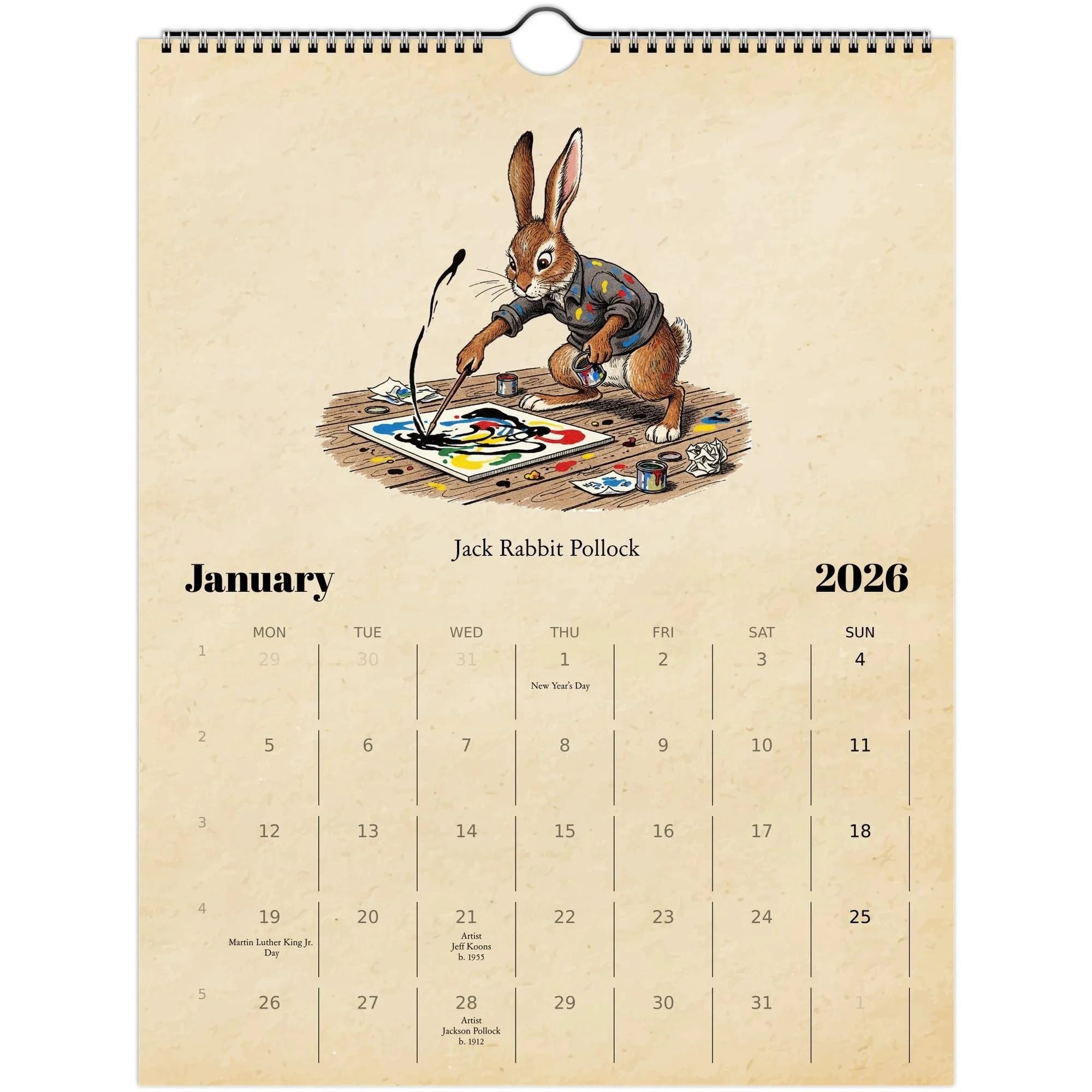 💡 Why You’ll Love It From Jack Rabbit Pollock’s splatter to Frida Catlo’s floral flair, each month adds a smile and spark of creativity to your wall. A charming balance of fine-art parody and nostalgic illustration — sure to delight every art lover.
