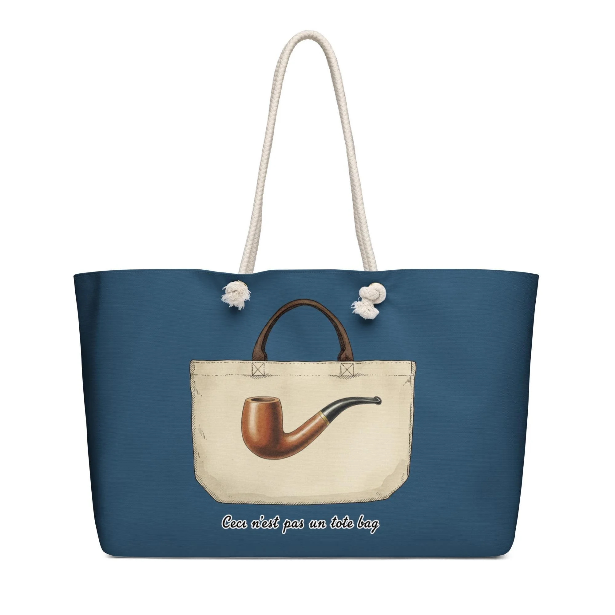 A surreal twist on the everyday bag — Magritte would approve. This witty “Ceci n’est pas un tote bag” weekender turns fine art philosophy into practical style.