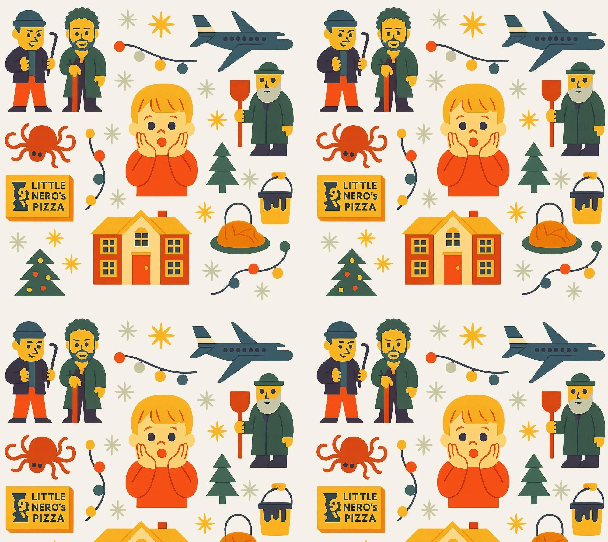 The Design This unique pattern features a repeating collection of familiar, stylized icons, including: A frantic young fellow holding his face A familiar paint bucket and feathered friends The neighborhood pizza delivery box Two classic, if slightly grumpy, "Wet Bandits" It captures that specific feeling of an eventful "Family Holiday Trip" gone slightly awry. This is the ultimate wrap for any parent or design lover who appreciates witty, elevated pop culture references.