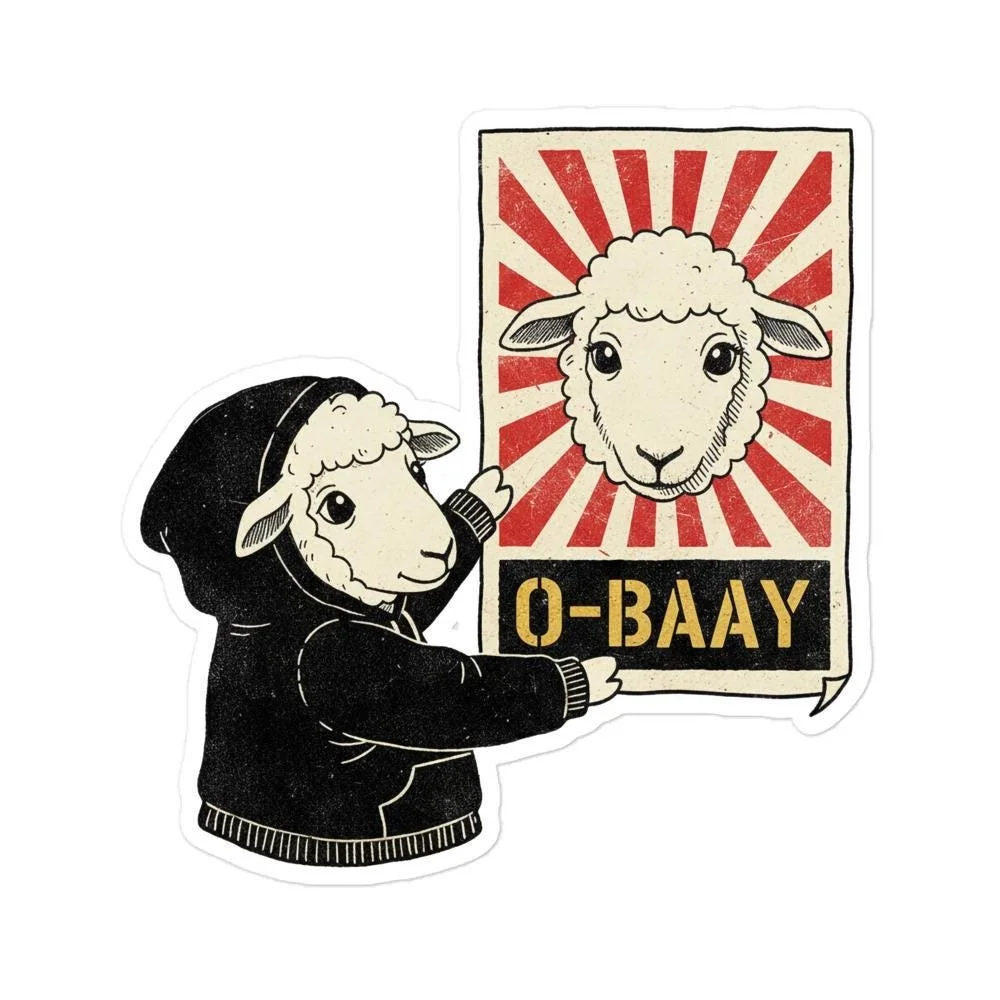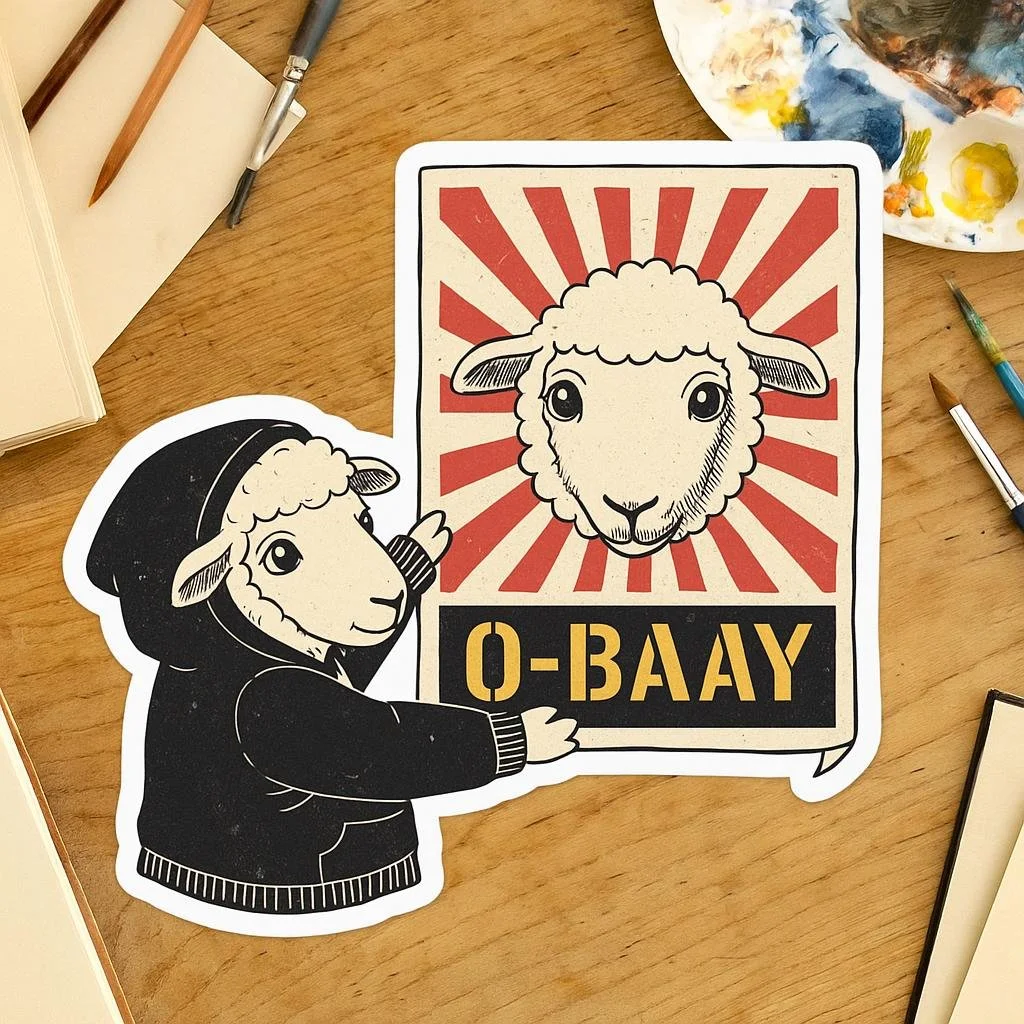 ✨ Description: Meet O-BAAY, the woolly wonder of street art! Inspired by Shepard Fairey’s iconic propaganda style, this clever sheep reimagines the “OBEY” poster with a soft twist. Dressed in a hoodie and bold red sunburst backdrop, this sticker blends clever parody with vintage print charm — perfect for fans of pop culture, design, and animals with attitude. Stick it on your laptop, sketchbook, or studio wall and let this little lamb make a big statement.