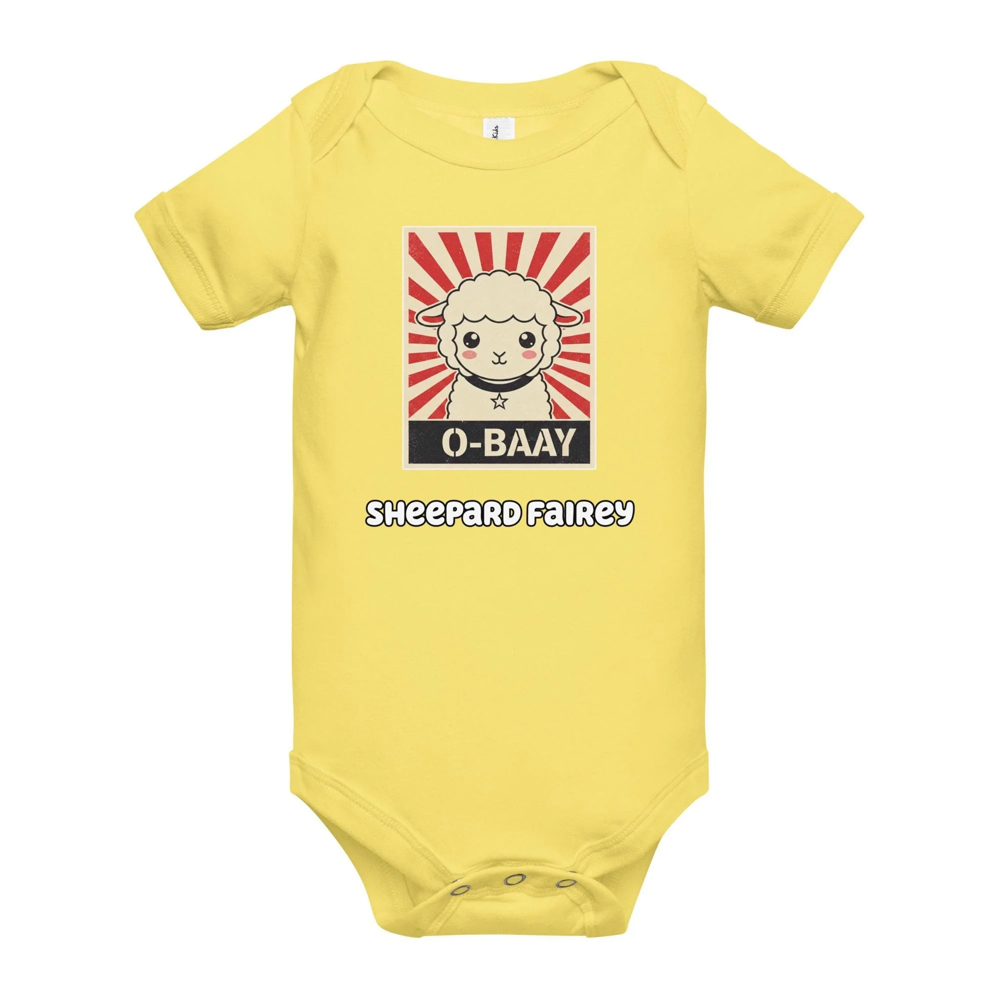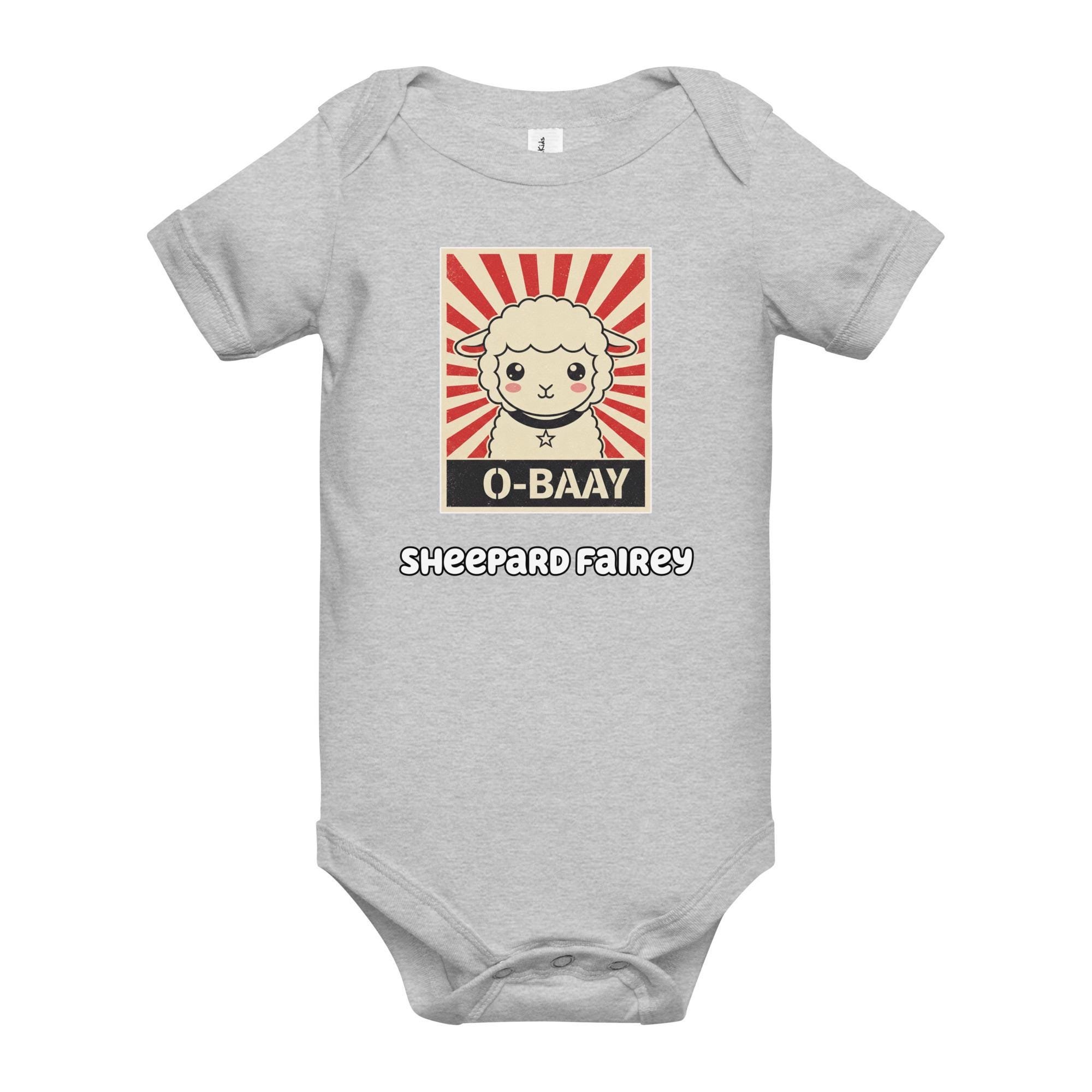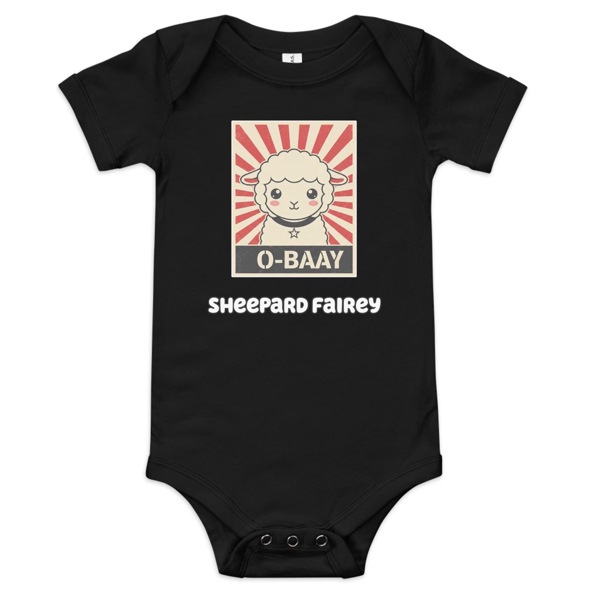 Demand cuteness in a bold way! This hilarious Sheepard Fairey Baby Bodysuit features an adorable lamb in the style of a classic street art poster, with the unforgettable message "O-BAAY." It's a witty, high-impact tribute to pop culture and propaganda art, perfect for the baby who runs the household. Key Features: Soft, baby-friendly cotton; convenient snap closures; unique, high-contrast street art graphic.