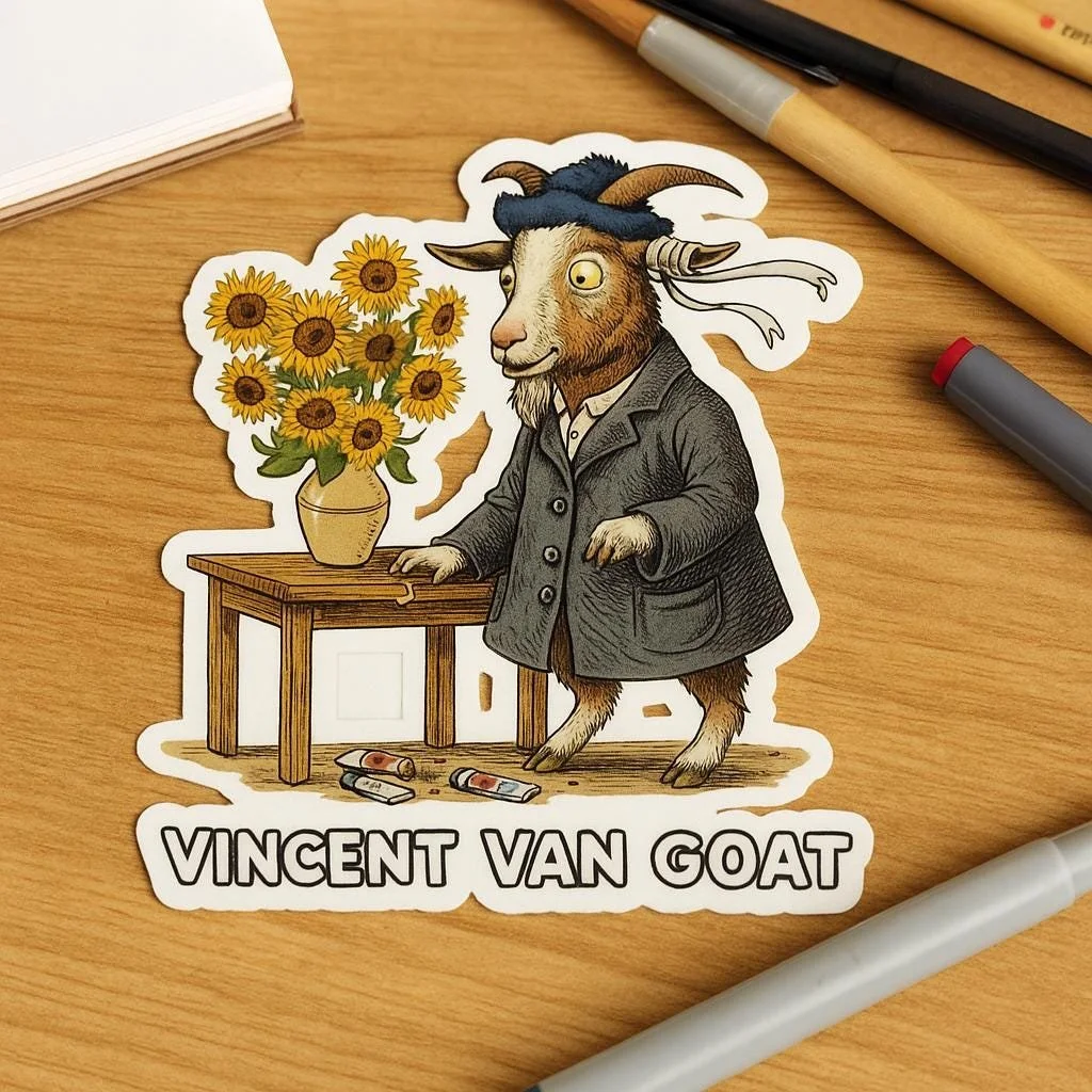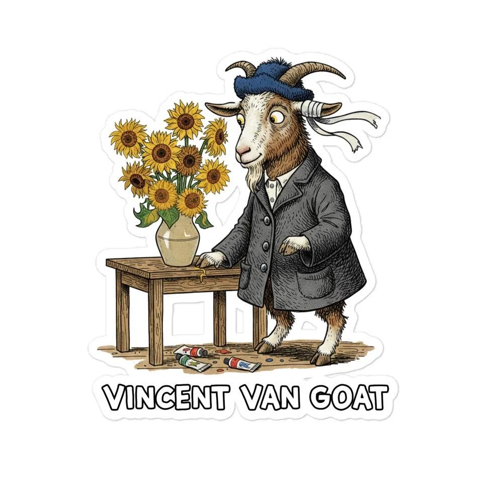 ✨ Description: Say hello to Vincent Van Goat, the most expressive goat in the art world! Inspired by the works of Vincent van Gogh, this hand-illustrated sticker features our gentle goat painter in his classic coat and blue cap, standing beside a vase of sunny blooms. Perfect for artists, teachers, or anyone who loves puns and creativity, this sticker brings warmth and whimsy wherever you place it—laptops, notebooks, or water bottles.