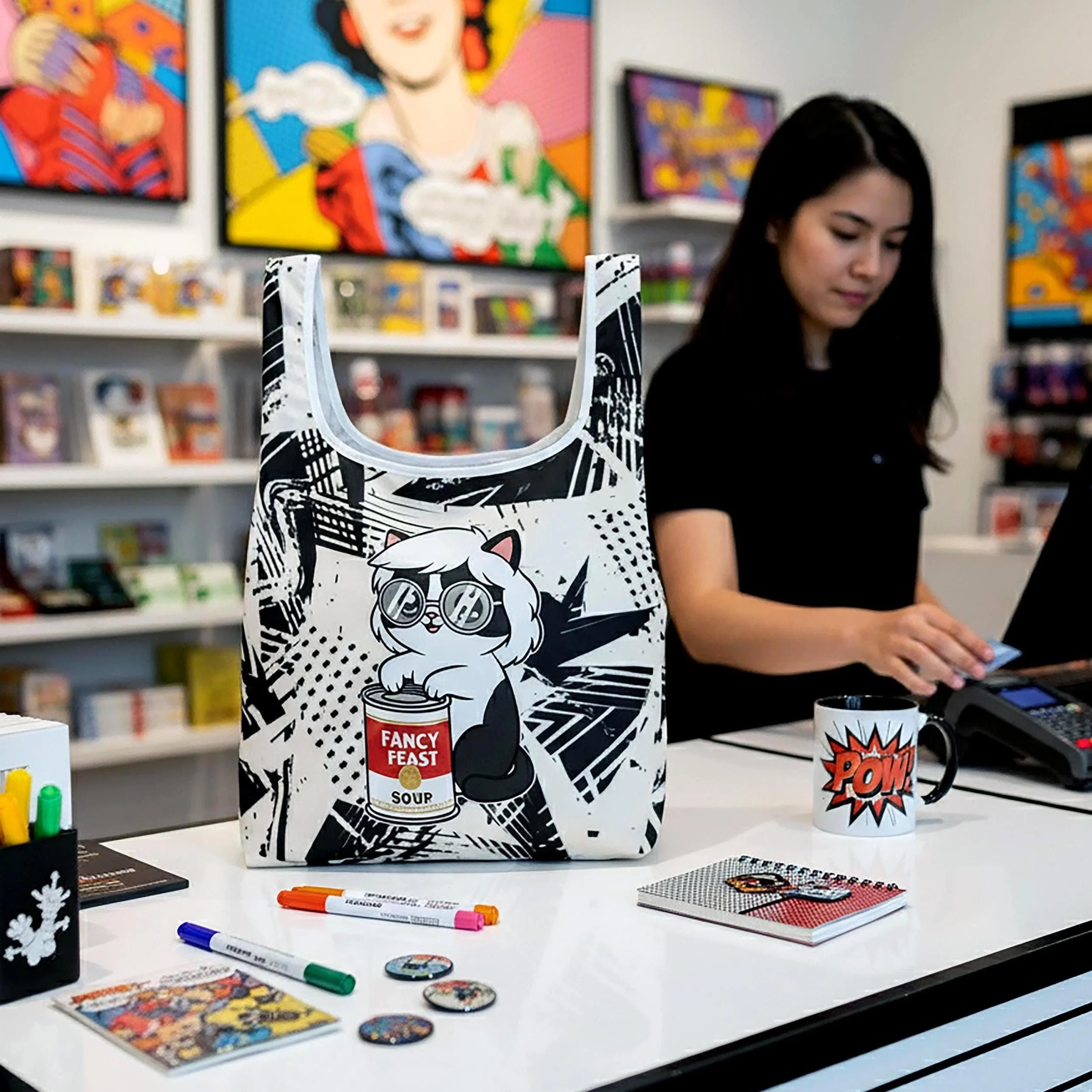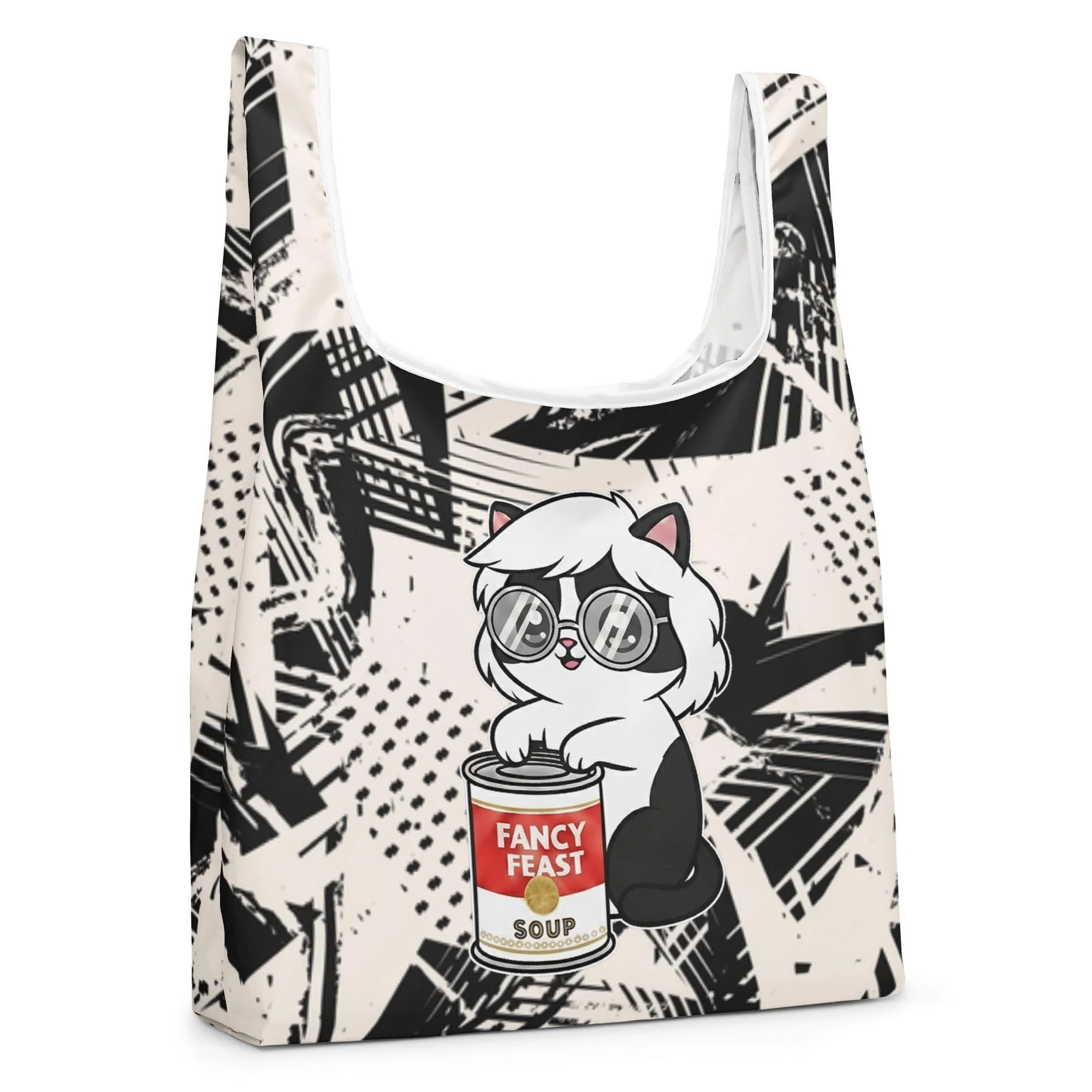 The Fancy Feast shopping bag brings Warhol’s iconic silkscreen energy to everyday errands. Its bold black-and-white graphic background captures the spirit of ’60s New York pop art — with a twist: a chic kitty channeling the Factory era, clutching her own “Fancy Feast Soup” can.